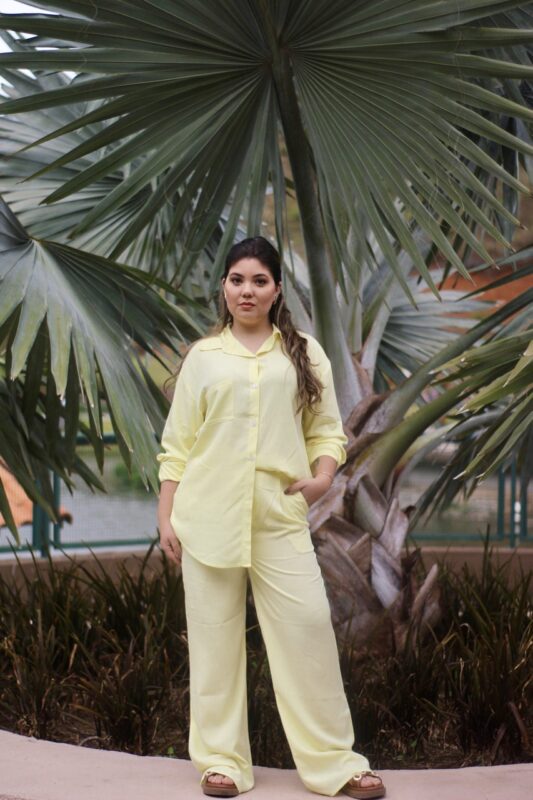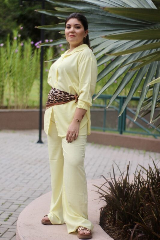 A modelagem é ampla e confortável, com ajuste soltinho na camisa e caimento leve na calça pantalona, garantindo elegância sem perder a liberdade de vestir.