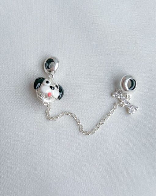 O Pega Ladrão em Prata 925 – Cachorrinho com Osso e Corrente de Segurança é um acessório cheio de carinho e significado, perfeito para quem ama animais e deseja adicionar um toque de originalidade à pulseira. Seu design detalhado traz um cachorrinho esmaltado em preto e branco, conectado a um pingente de osso cravejado com zircônias brancas, criando uma composição delicada e cheia de brilho.
